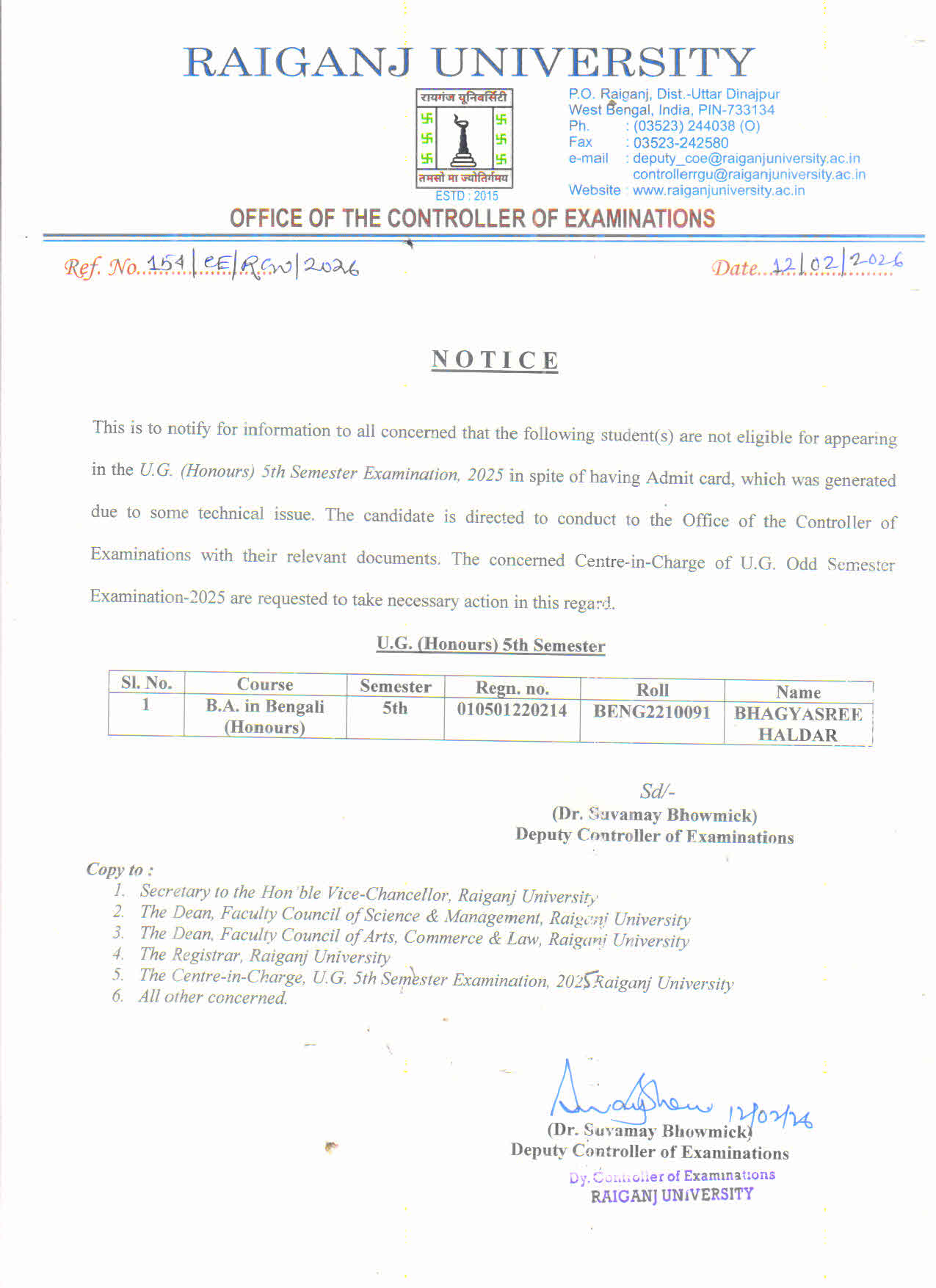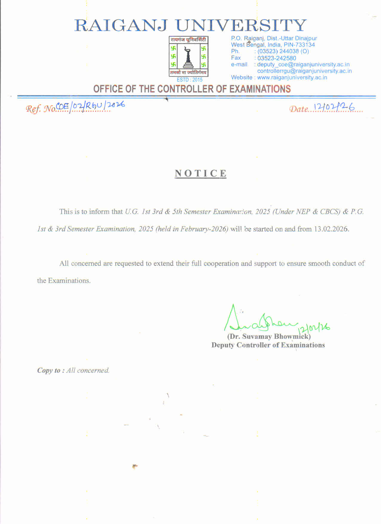 Notice relating to U.G. & P.G. Odd Semester Examination, 2025
