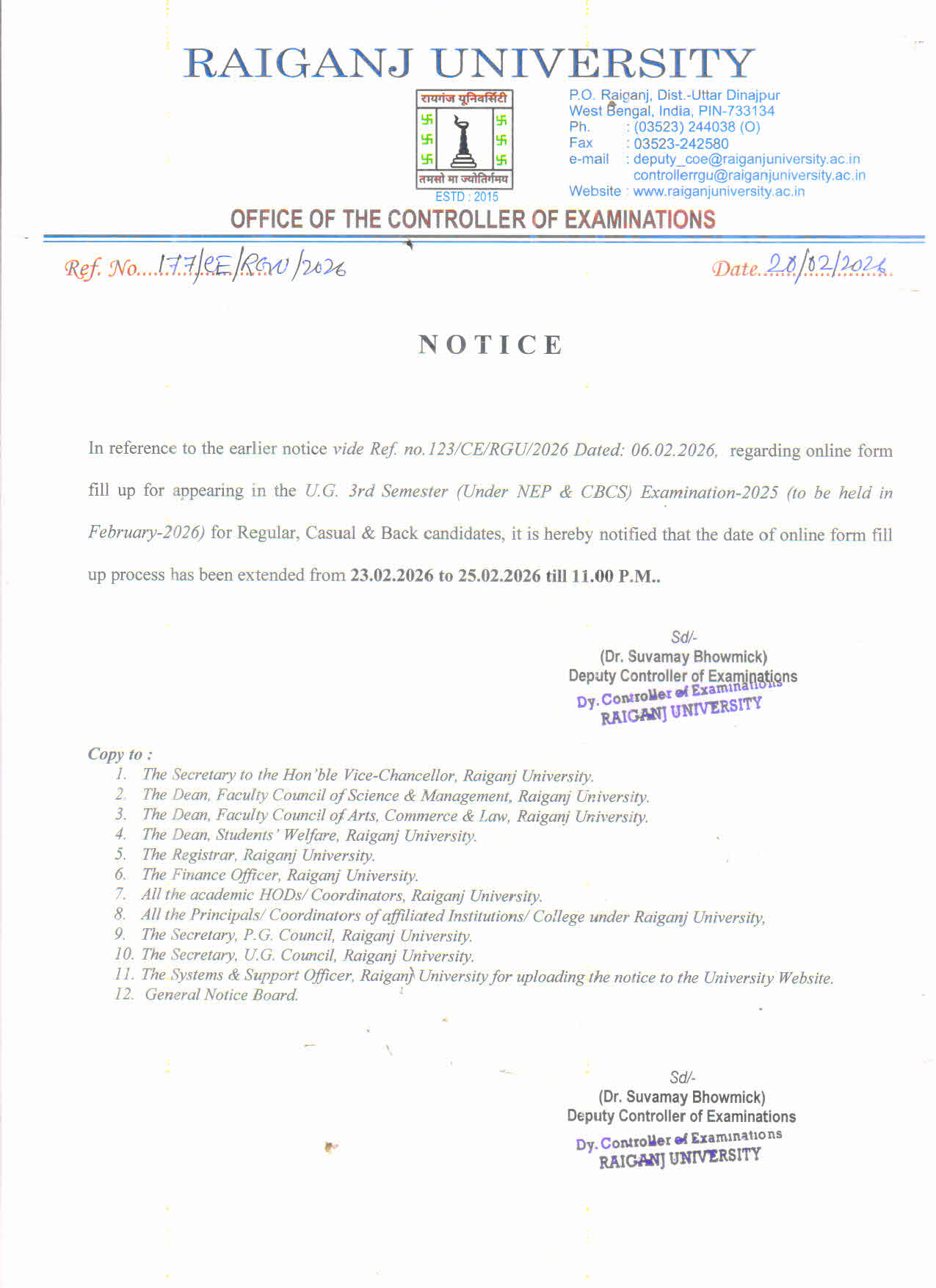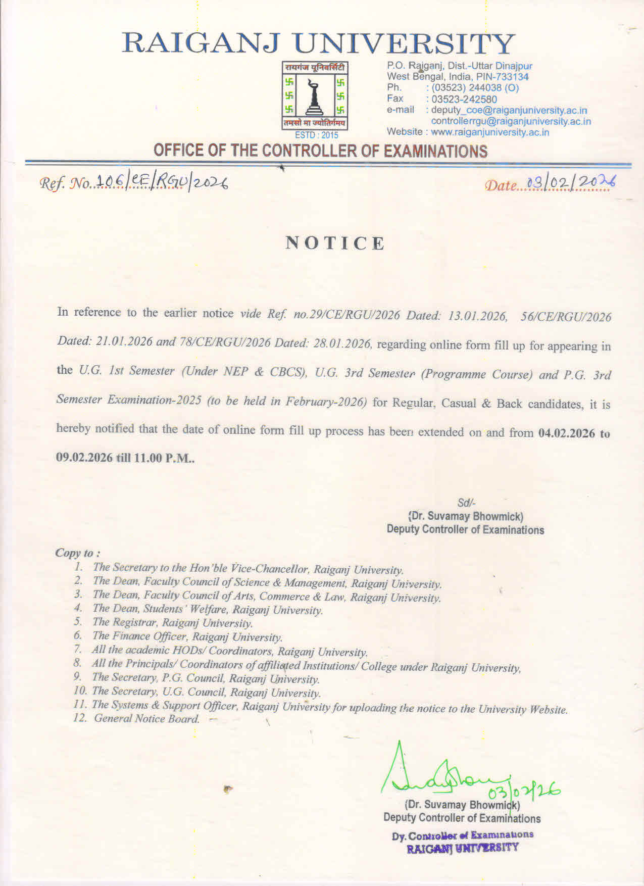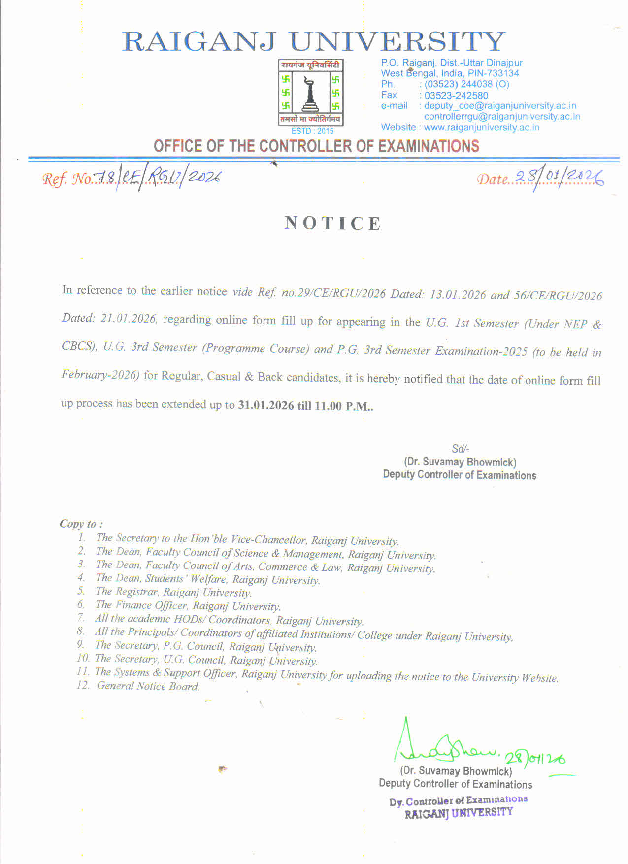 Notice extension of date for online form fill up for Odd Sem Exam-2025