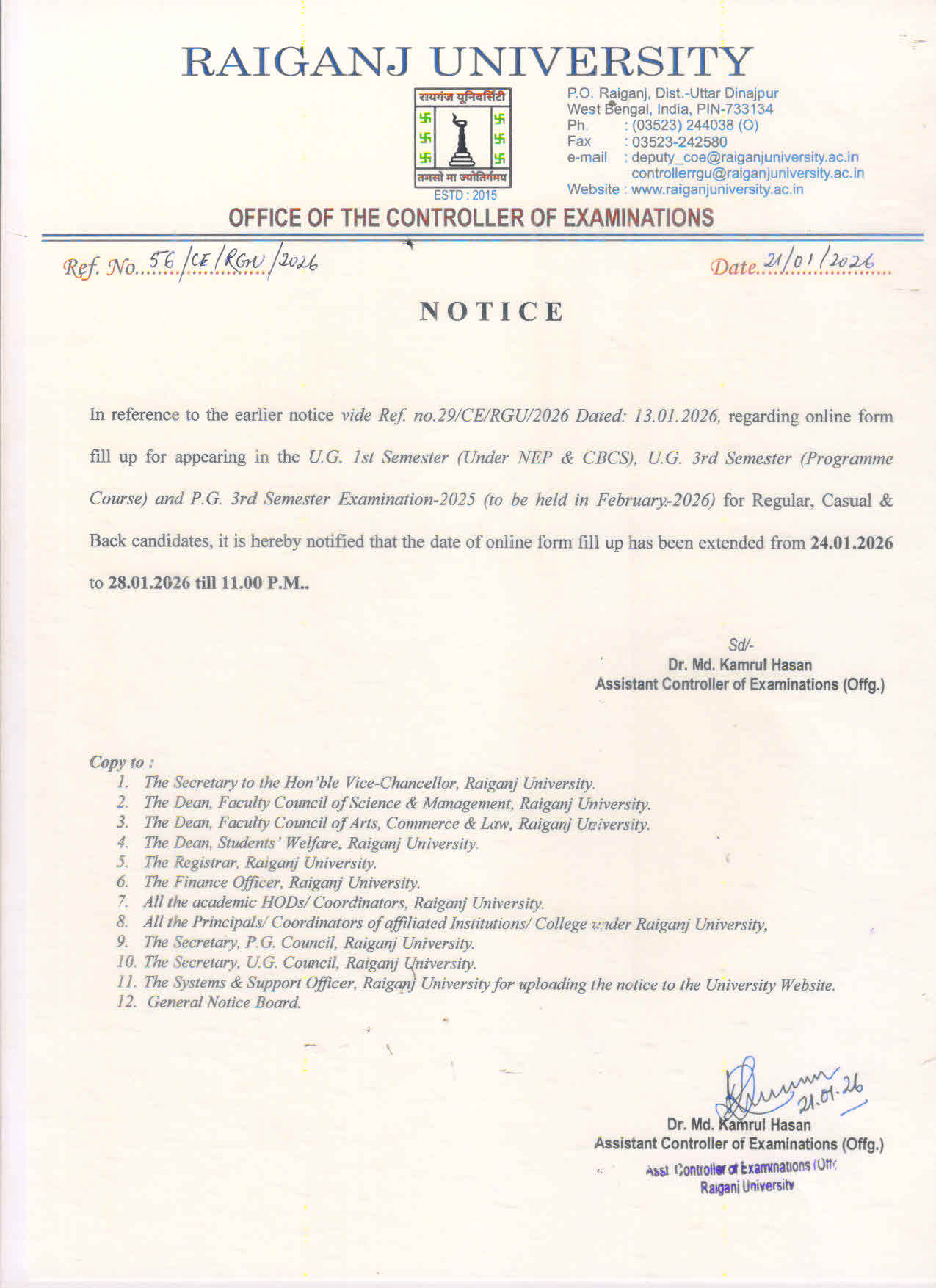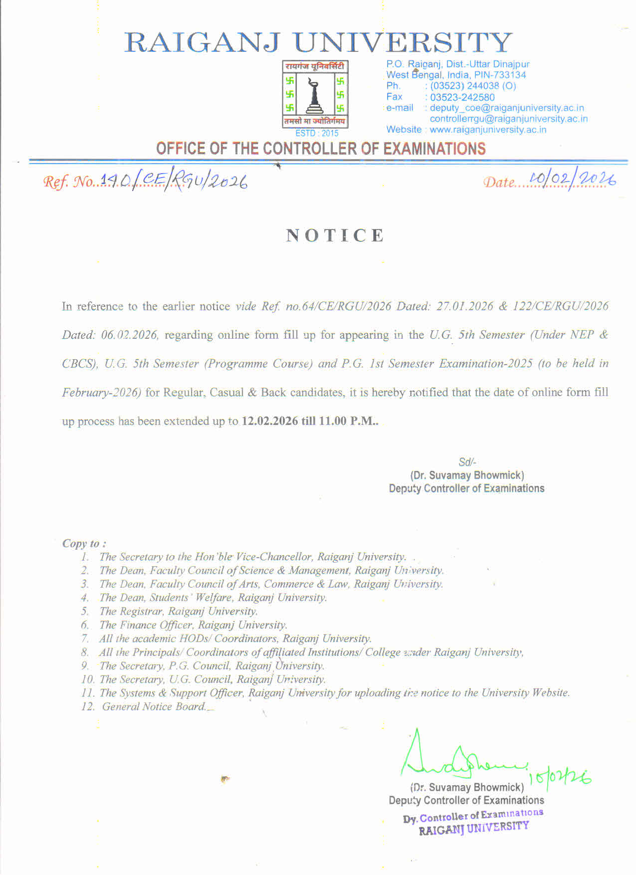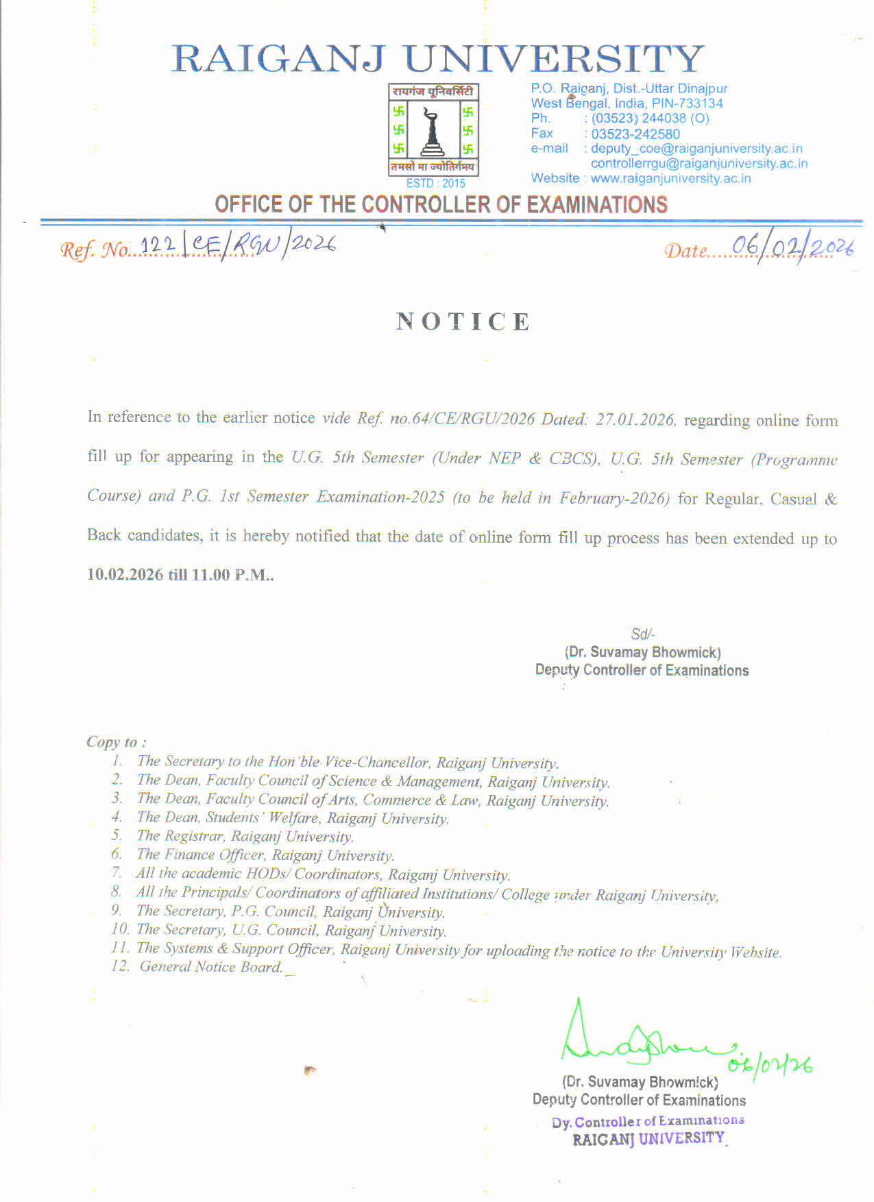 Notice extension of date for online form fill up for Odd Sem Exam-2025