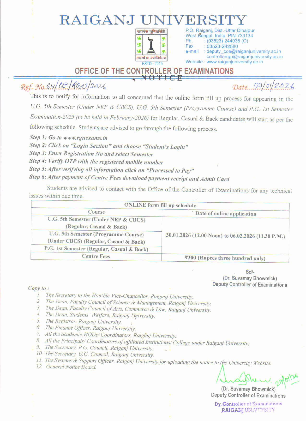 Notice for online form fill up for Odd Sem Exam-2025 for students