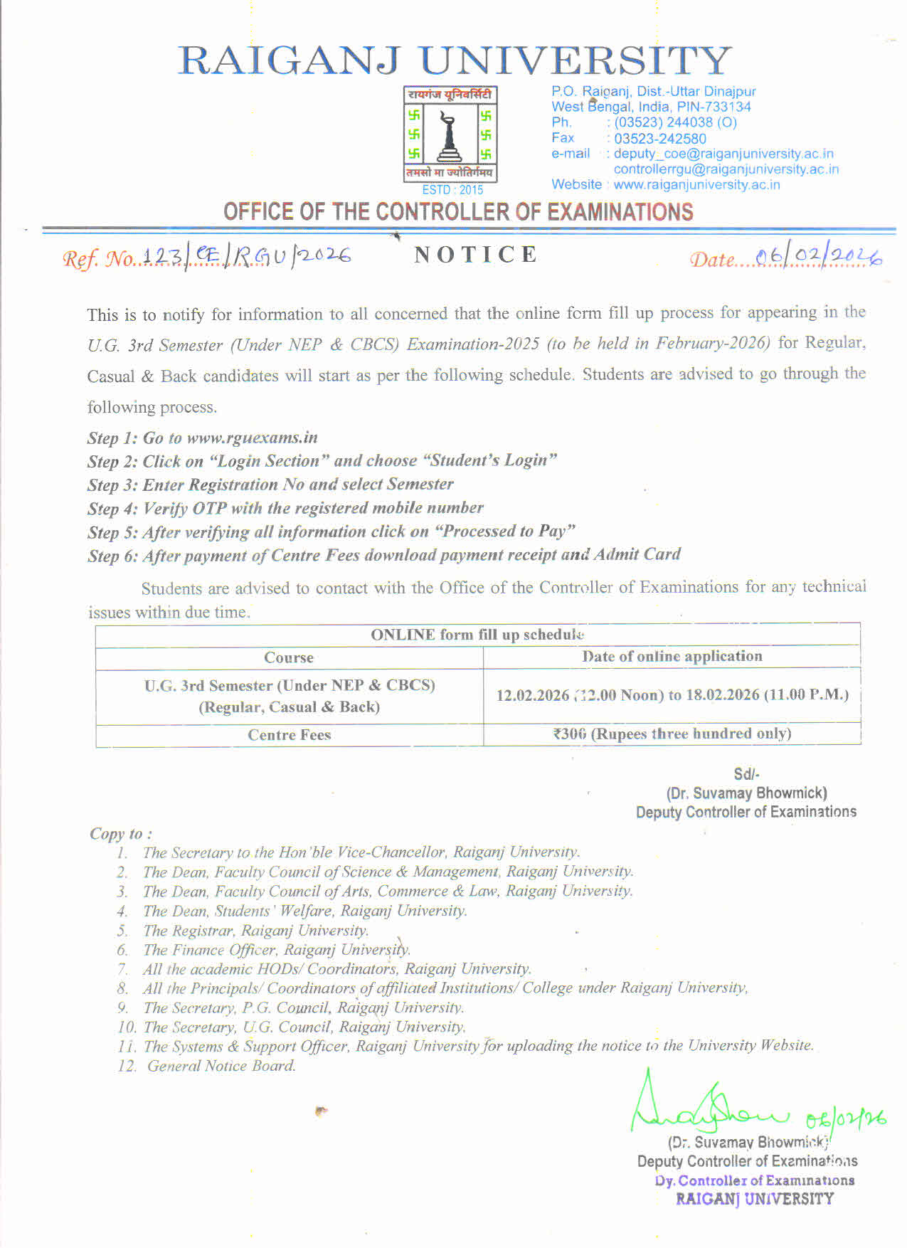 Notice for online form fill up for UG 3rd Sem Exam-2025