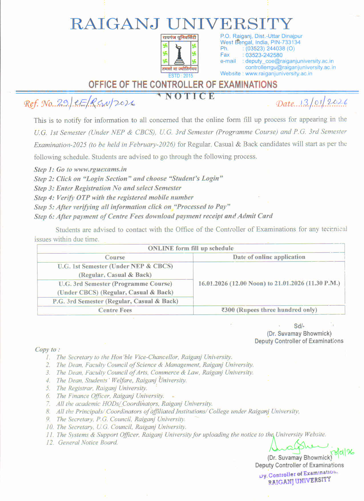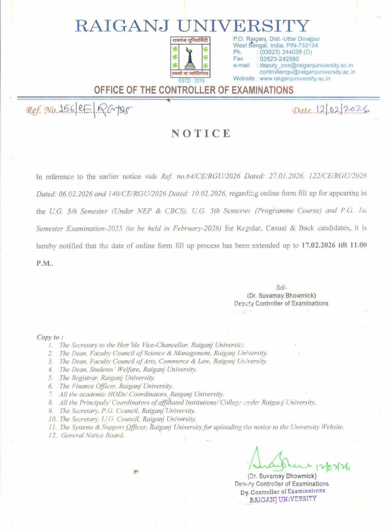 Notice extension of date for online form fill up for Odd Sem Exam-2025